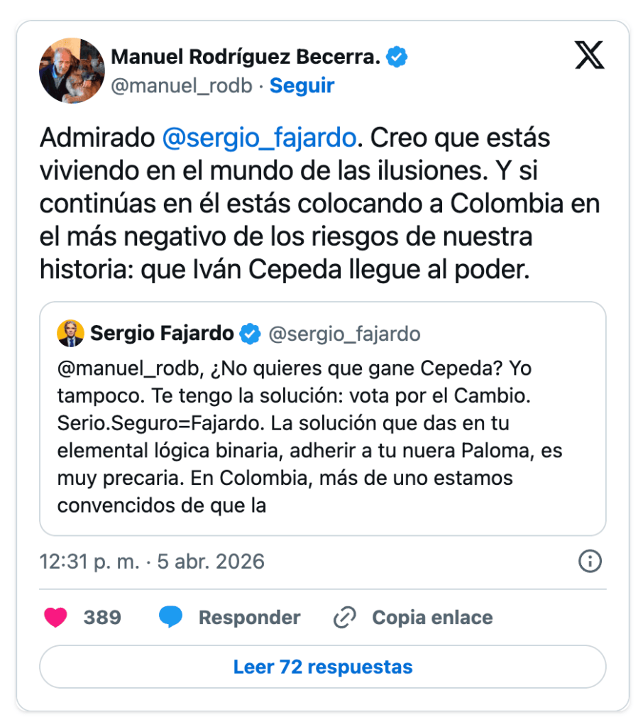 El exministro y académico, después de llamar “admirado” al candidato presidencial que se le conoce como “El profe”, prácticamente señaló a Fajardo de estar poniendo a Colombia contra las cuerdas. No solo le dijo que estaba viviendo en un mundo de ilusiones, sino que, si continuaba allí “estás colocando a Colombia en el más negativo de los riesgos de nuestra historia: que Iván Cepeda llegue al poder”.